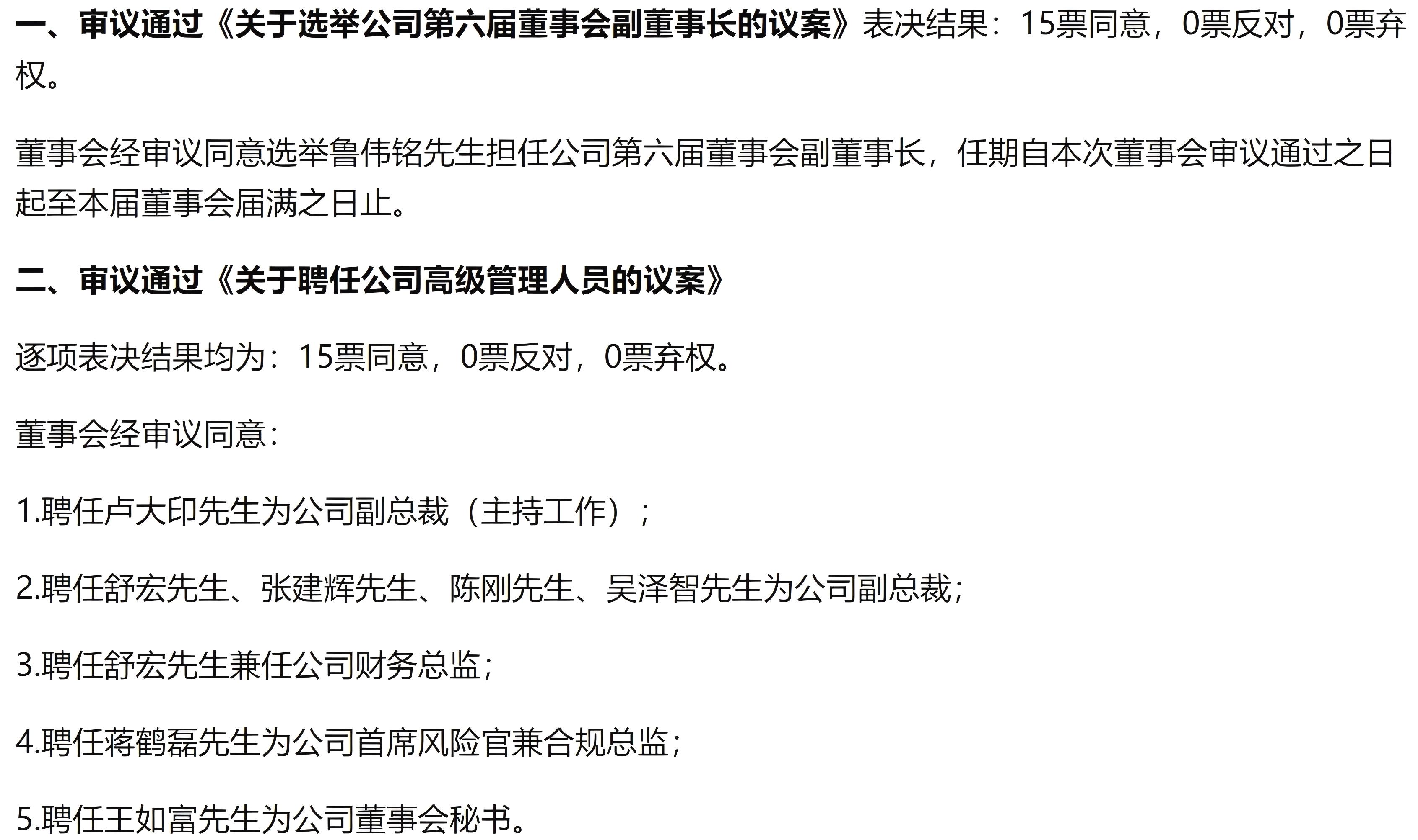 根据公告,鲁伟铭被选为副董事长;卢大印被聘为副总裁(主持工作);舒宏、张建辉、陈刚、吴泽智被聘为副总裁,其中聘任舒宏兼任财务总监;聘任蒋鹤磊为首席风险官兼合规总监;聘任王如富为董事会秘书。