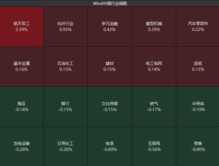 盘面上,航天航空板块领涨,中航系普遍拉升,橡胶制品股涨幅居前,商业百货、游戏股跌幅居前。