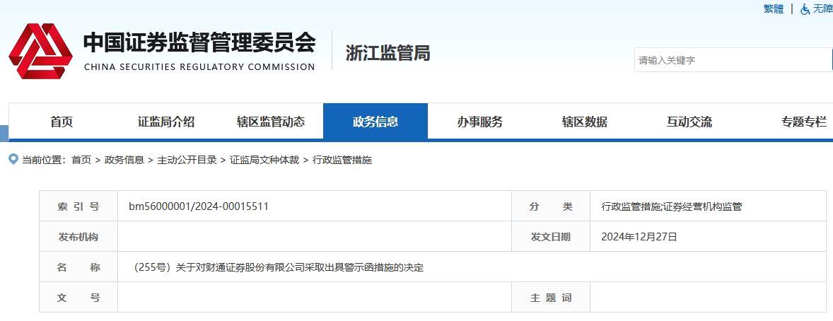 燃点网12月27日电 据浙江证监局网站27日消息,浙江证监局对财通证券股份有限公司(下称“财通证券”)出具警示函。