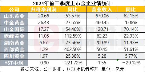 在高金价背景下,截至今年前三季度,各大上市金企业绩纷纷报喜;除已“披星戴帽”的*ST中润仍然亏损外,A股剩余七大金企中,归母净利润同比增幅均超25%,其中赤峰黄金(600988.SH)、西部黄金(601069.SH)归母净利润同比增幅已至少翻倍。