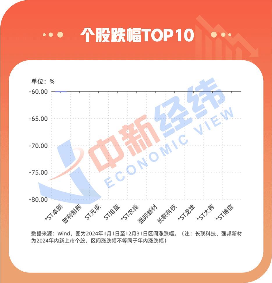 “V观财报”(微信号:VG-View)注意到,2024年跌幅居前10名的个股,多达7只是ST股。值得注意的是,长联科技、强邦新材为2024年内新上市个股,计算区间涨跌幅时剔除了上市首日涨跌幅。
