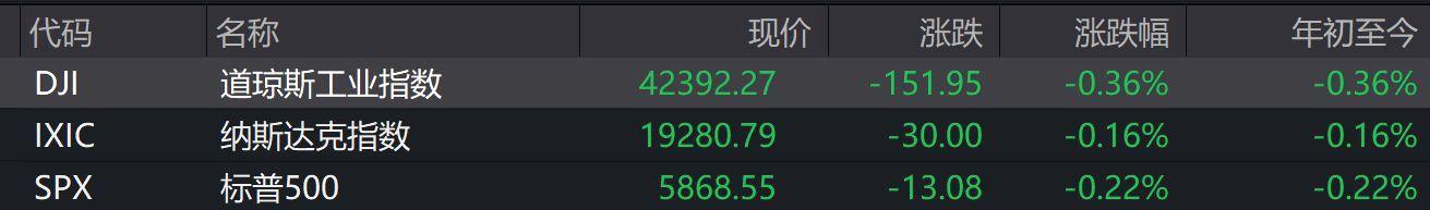 美东时间1月2日16:00(北京时间1月3日05:00),道指收跌151.95点,报42392.27点,跌幅为0.36%;纳指收跌30点,报19280.79点,跌幅为0.16%;标普500指数收跌13.08点,报5868.55点,跌幅为0.22%。