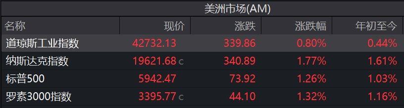 截至收盘,道指涨0.80%报42732.13点,终结4连跌;标普500指数涨1.26%报5942.47点,纳指涨1.77%报19621.68点,均终结5连跌。