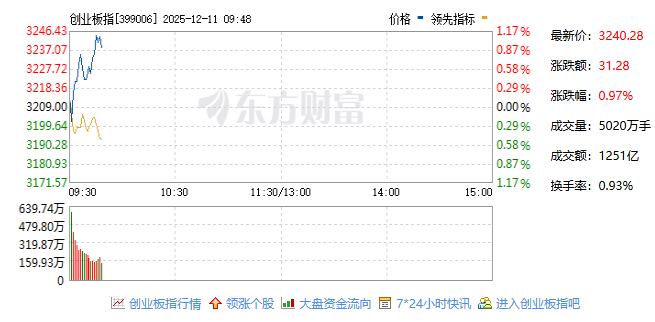 12月11日早盘,A股市场呈现结构性反弹格局。创业板指领涨主要指数,涨幅扩大至1%,展现出较强弹性;深证成指上涨0.5%,表现稳健;而上证指数微涨0.03%,在权重板块震荡整理下走势相对平缓。