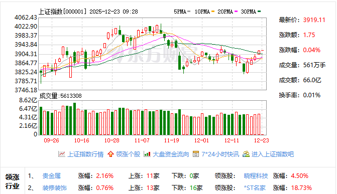 A股早盘三大股指集体高开,上证指数上涨0.04%,深证成指微涨0.05%,创业板指领涨,涨幅达0.14%,市场整体呈现温和回暖态势。