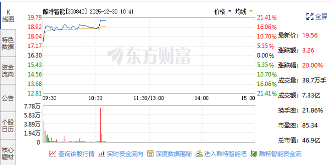 AI应用端持续走高,AI智能体方向强势领涨。12月30日盘中,酷特智能(300840)斩获“20cm”涨停;此前,湖北广电、南兴股份、正和生态已率先封板,蓝色光标涨超10%;中科金财、汉得信息、易点天下、宣亚国际等概念股纷纷跟涨,板块热度显著升温。