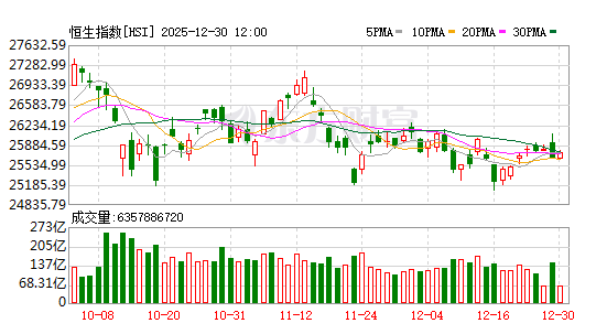 12月30日午盘,港股市场震荡走强。截至收盘,恒生指数报25,751.64点,上涨116.41点,涨幅0.45%;恒生科技指数表现更优,收报5,540.44点,涨57.43点,涨幅1.05%。