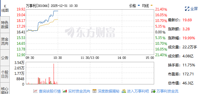 AI应用端持续走强,AI智能体方向强势领涨。12月30日盘中,万事利(301065)强势斩获“20cm”涨停;此前,南兴股份已实现两连板,利欧股份封板涨停;蓝色光标、宣亚国际涨超10%;汉得信息、酷特智能、福石控股、掌阅科技等概念股亦纷纷跟涨,板块热度全面升温。