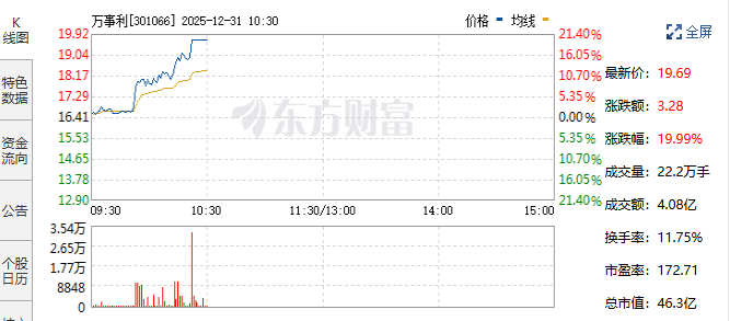AI应用端持续强势拉升,AI智能体方向领涨全市场。12月30日盘中,万事利(301065)强势斩获“20cm”涨停;此前,南兴股份已实现两连板,利欧股份封板涨停;蓝色光标、宣亚国际涨幅均超10%;汉得信息、酷特智能、福石控股、掌阅科技等概念股亦集体跟涨,板块热度全面爆发。