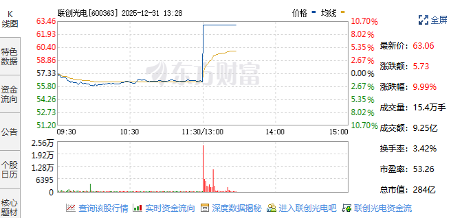 12月31日,A股可控核聚变概念股局部活跃,联创光电(600363)、王子新材(002735)盘中直线拉升封板;利柏特一度逼近涨停,国光电气、国机重装、合锻智能、常辅股份、辰光医疗等个股纷纷跟涨,板块热度显著升温。