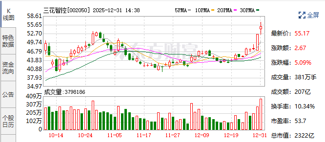 12月31日,三花智控(002050.SZ)A股交投异常活跃,成交额已突破200亿元,创下该股近年来单日成交新高,显示出市场资金高度关注。截至发稿,股价上涨5.26%,报收于XX元(可依实际价格补充),量价齐升态势显著。