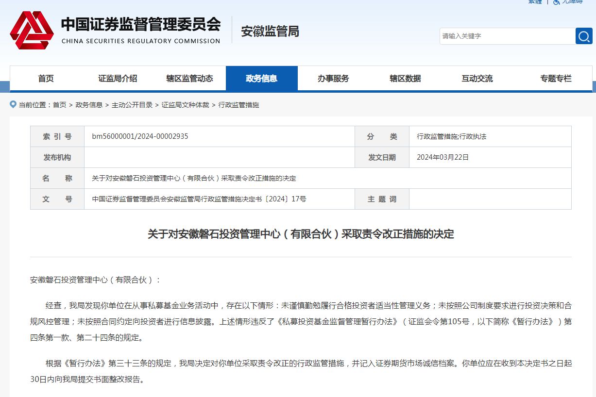 安徽证监局网站22日发布的《关于对安徽磐石投资管理中心(有限合伙)采取责令改正措施的决定》显示,经查,安徽证监局发现磐石投资管理中心在从事私募基金业务活动中,存在以下情形:未谨慎勤勉履行合格投资者适当性管理义务;未按照公司制度要求进行投资决策和合规风控管理;未按照合同约定向投资者进行信息披露。