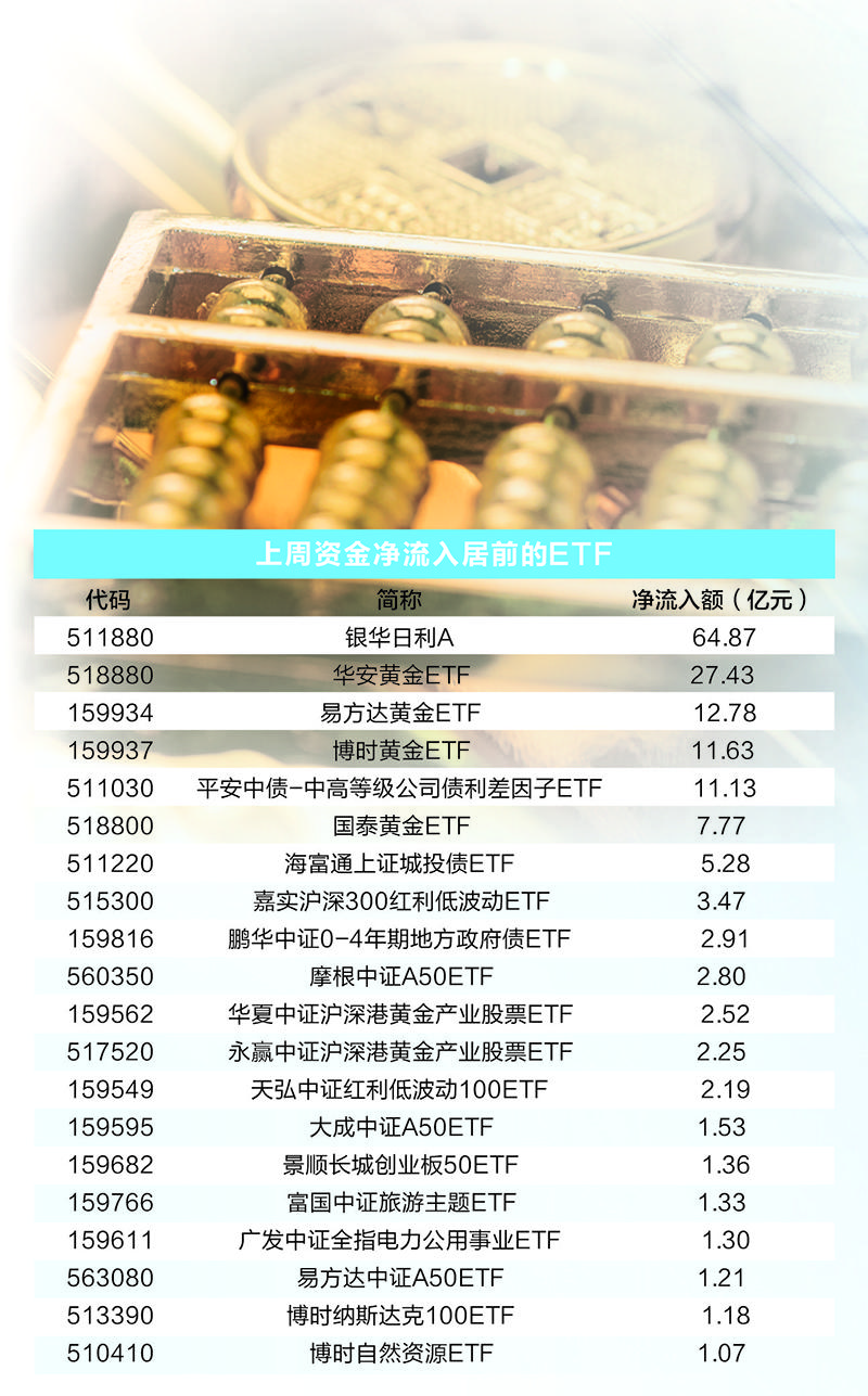 此外,上周债券类ETF同样获得投资者的青睐,平安中债-中高等级公司债利差因子ETF、海富通上证城投债ETF、鹏华中证0-4年期地方政府债ETF获得资金净流入11.13亿元、5.28亿元、2.91亿元。