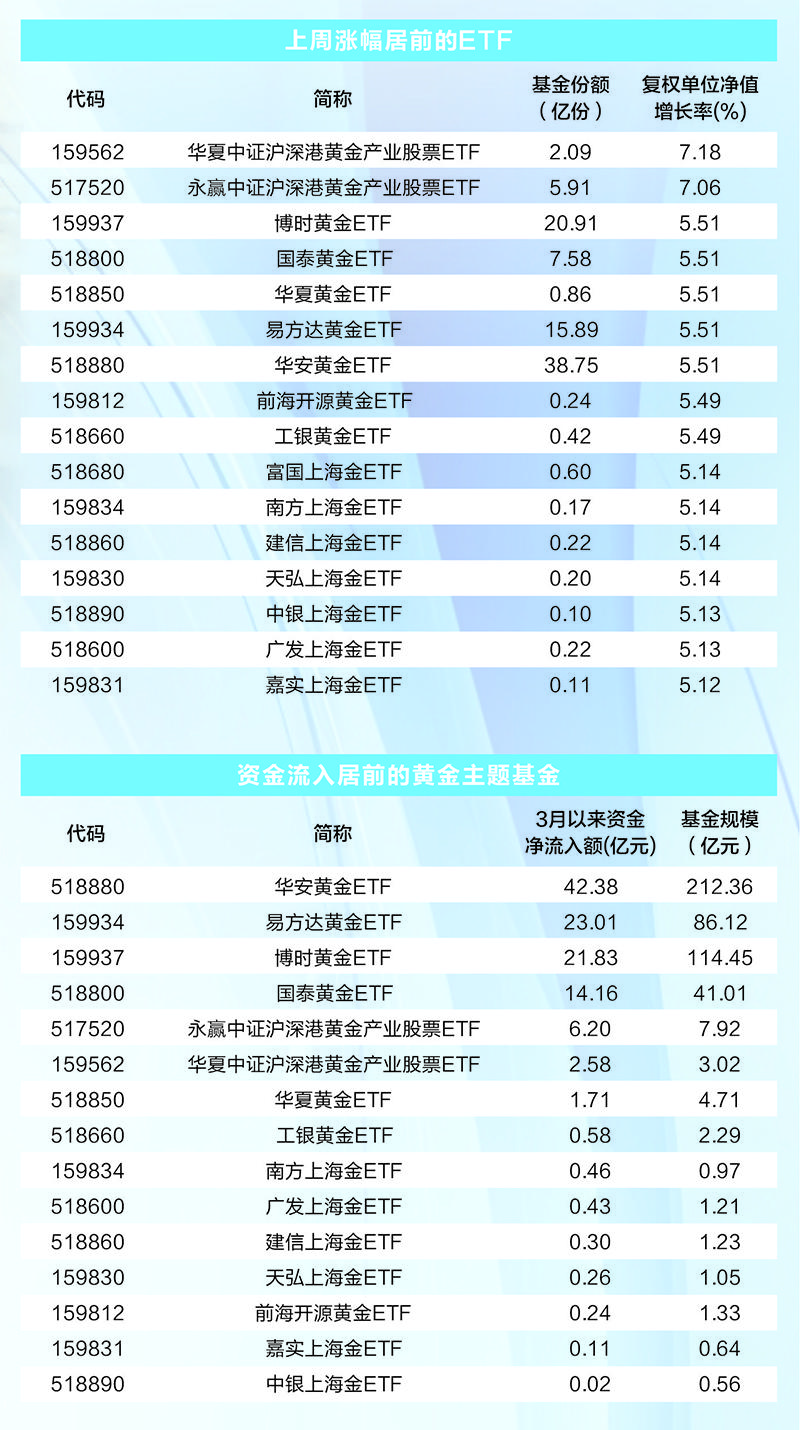 3月以来,永赢中证沪深港黄金产业股票ETF、华夏中证沪深港黄金产业股票ETF、南方上海金ETF、建信上海金ETF、中银上海金ETF等超15只黄金ETF年涨幅超15%。