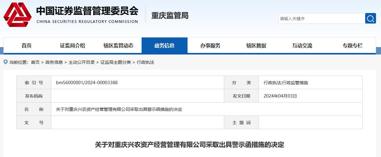 燃点网4月3日电 据重庆证监局网站3日消息,重庆证监局对重庆兴农资产经营管理有限公司采取出具警示函措施的决定。