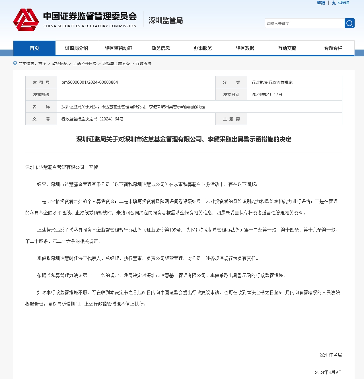 依据《私募管理办法》第三十三条的规定,深圳证监局决定对深圳市达慧基金管理有限公司、李健采取出具警示函的行政监管措施。
