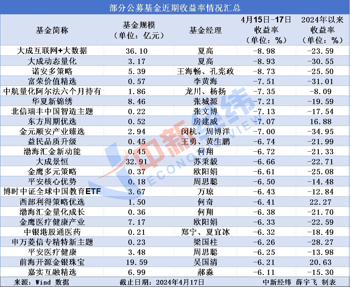 15日至17日,全市场有23只公募基金的收益率在-6%至-10%之间,有多只都是重仓小盘股或微盘股的主动权益型产品。