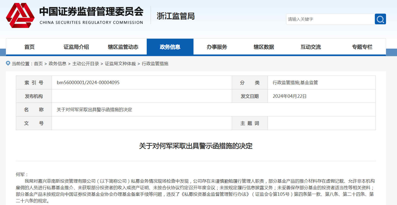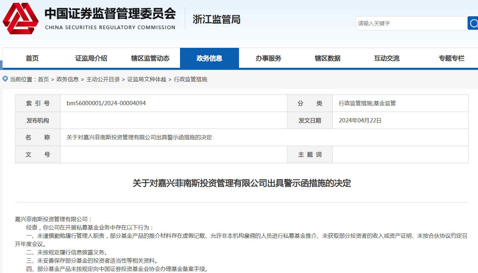 燃点网4月22日电 浙江证监局网站22日披露,嘉兴菲南斯投资管理有限公司被警示。