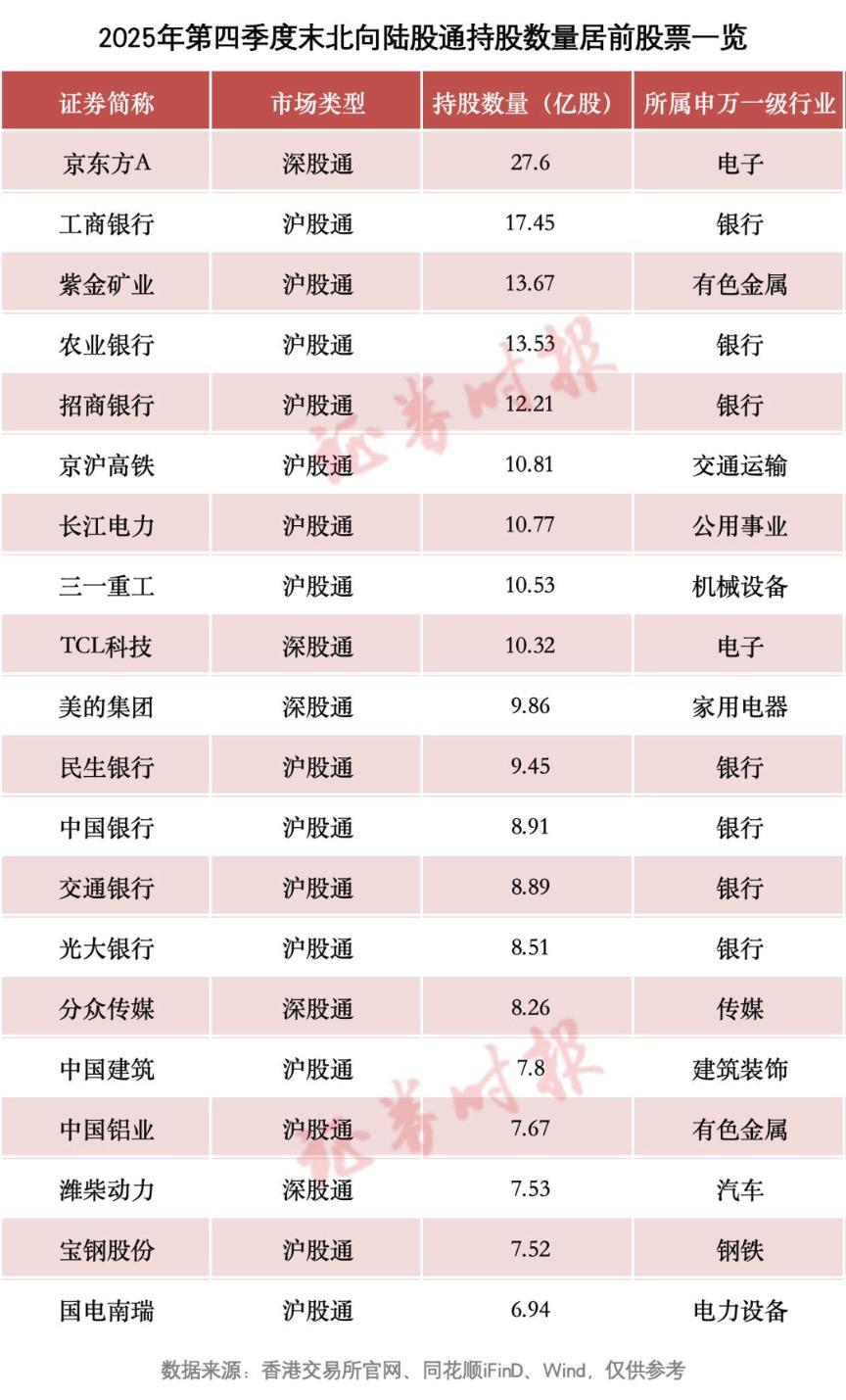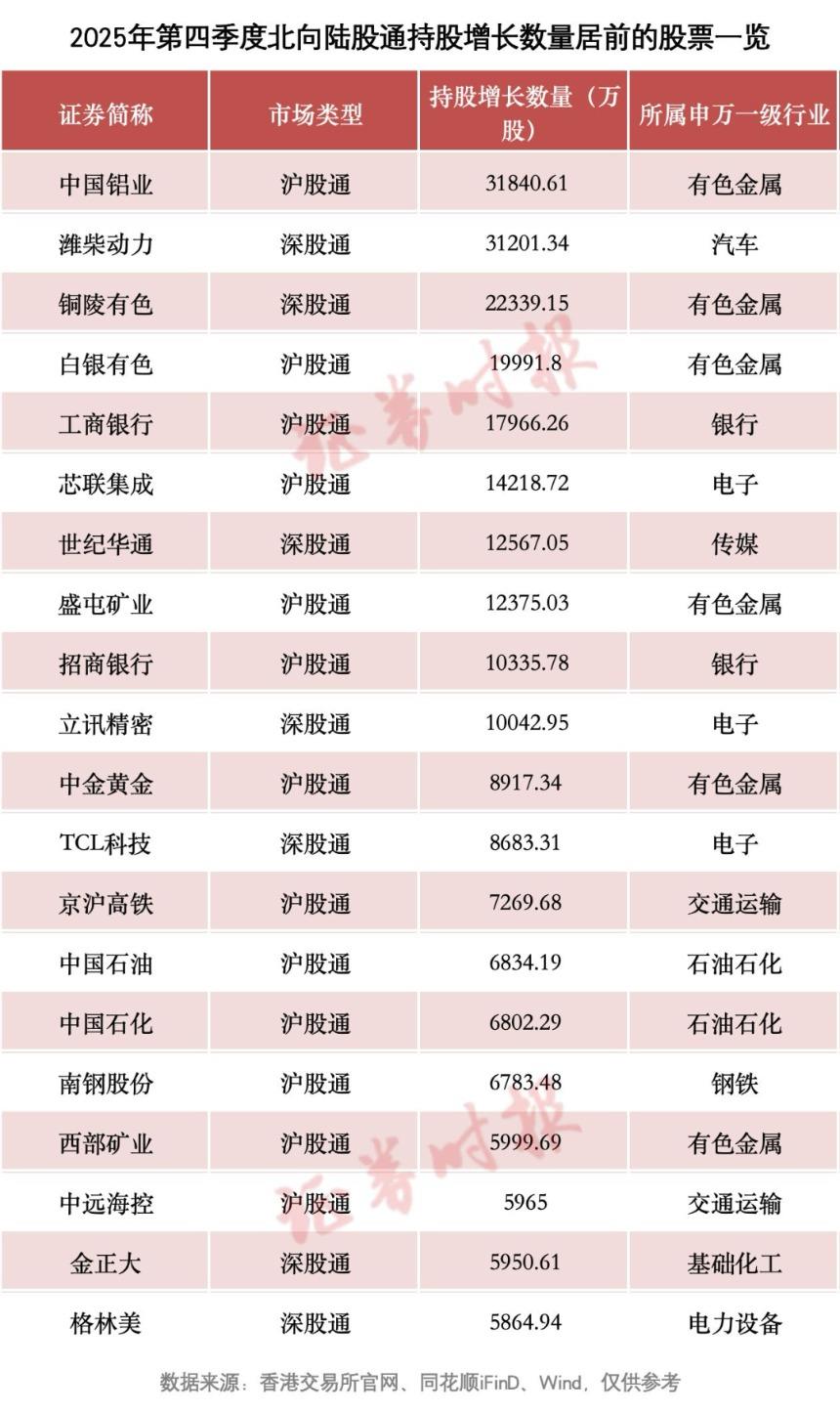 根据网站披露的资料,北向陆股通(含和,下同)2025年第四季度末的持股数据正式披露,北向陆股通资金在2025年第四季度的持股动向也初步浮出水面。