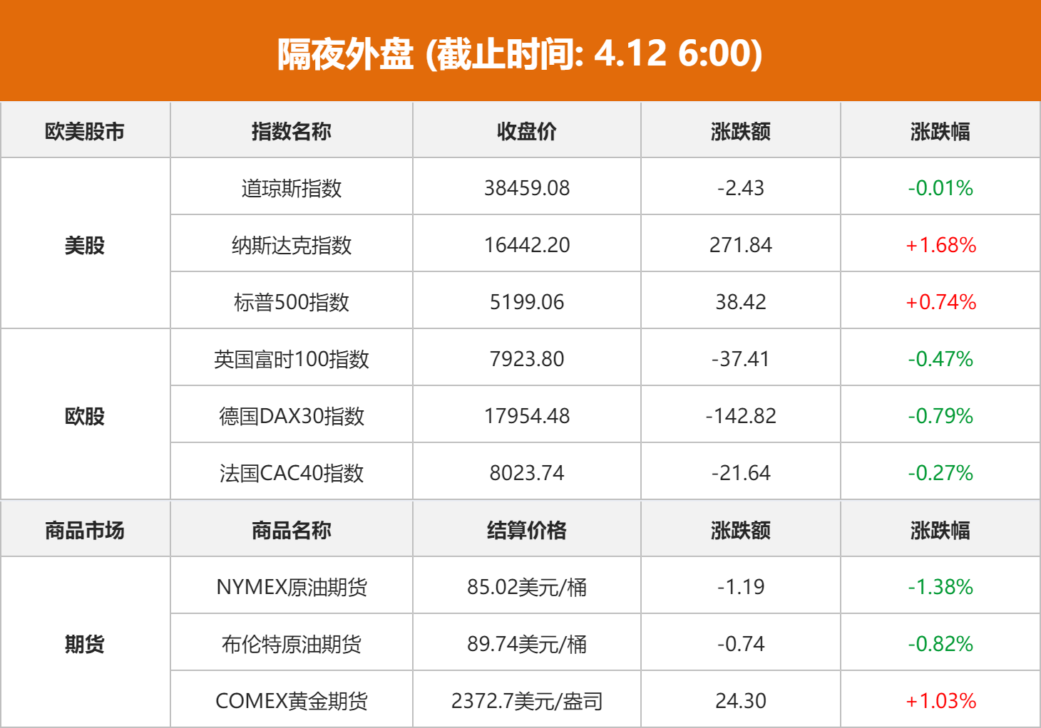 美股市场:美股三大指数涨跌不一,纳指涨逾1%,截止收盘,道琼斯工业平均指数比前一交易日下跌2.43点,收于38459.08点,跌幅为0.01%;纳斯达克综合指数上涨271.84点,收于16442.2点,涨幅为1.68%;标准普尔500种股票指数上涨38.42点,收于5199.06点,涨幅为0.74%。数据方面,美国3月PPI同比增速2.1%略低于预期,环比增速超预期放缓至0.2%;3月核心PPI连续三个月环比加快增长至2.4%,略高于预期增速,而环比增速较2月放缓至0.2%,符合预期。