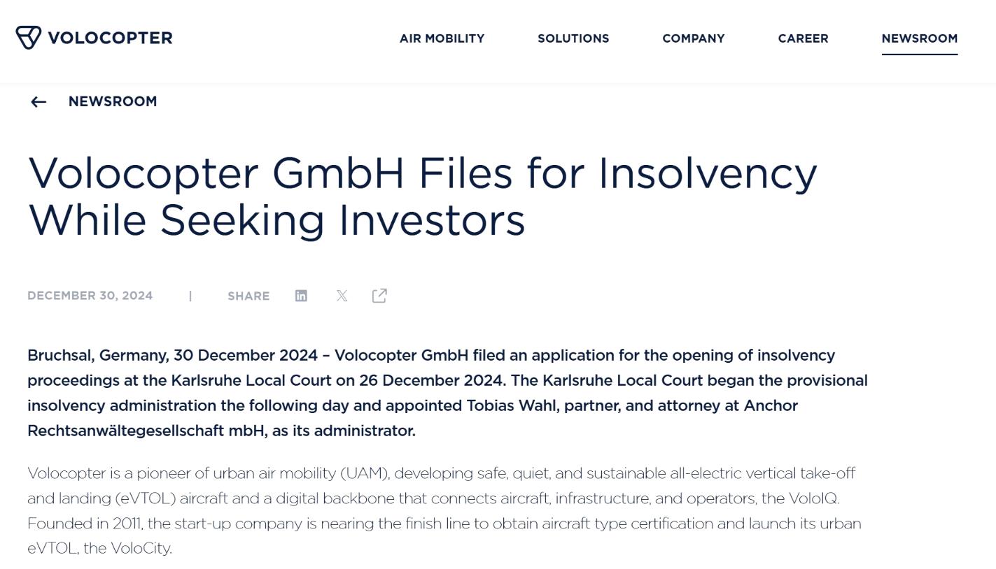 公告同时披露,尽管Volocopter算是这个行业里“烧钱最慢”的公司之一,但依然找不到在破产程序以外维持正常运营的可行方案。