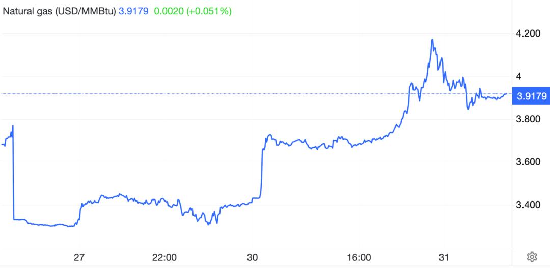 美国2月份交割的天然气期货在周一盘中大幅上涨,最高涨幅一度达到24%,收盘时涨幅回落至16.34%,报3.9360美元/百万英热单位。