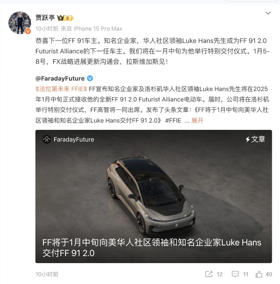 随后,贾跃亭转发该条动态表示:“将在一月中旬为他举行特别交付仪式。1月5-8号,FX战略进展更新沟通会,拉斯维加斯见!”