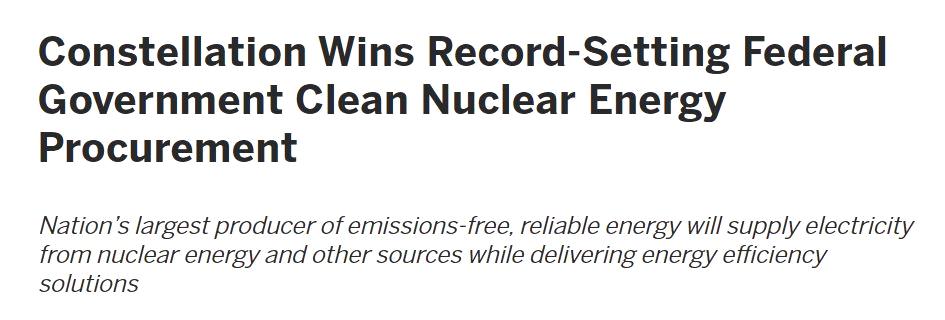 周四那天,美国星座能源公司可真是大赢家,他们官网上宣布了一条大新闻:从美国联邦政府那儿拿到了一个超级大的清洁核能采购合同,据说价值高达十亿美元呢。