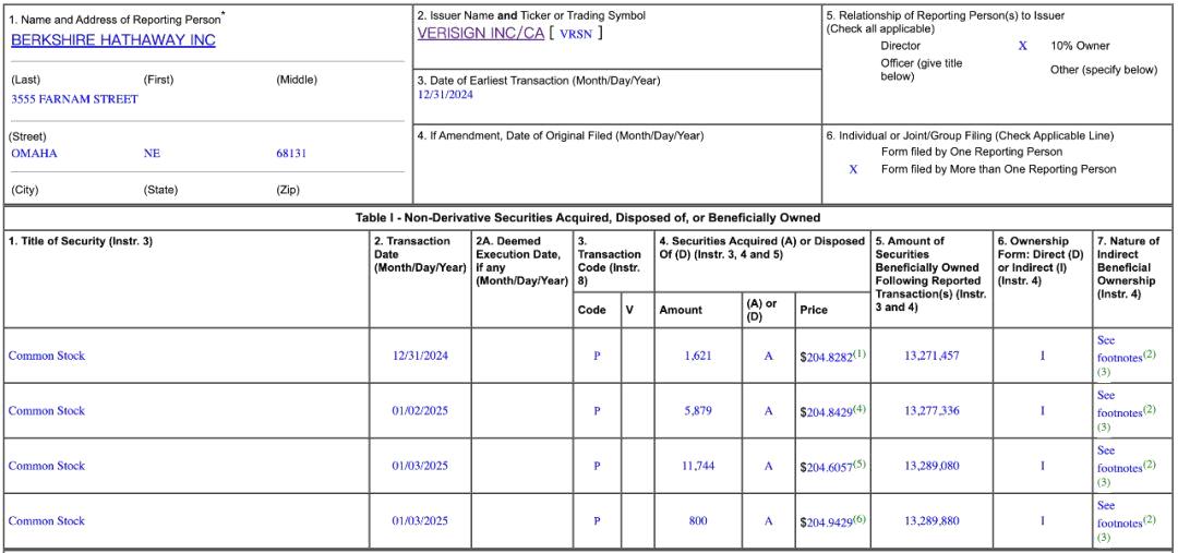 伯克希尔向美国证券交易委员会(SEC)最新提交的文件显示,其在2024年12月31日至2025年1月3日买入了约2万股威瑞信(VeriSign)普通股,总金额约410万美元,约合人民币3000万元。