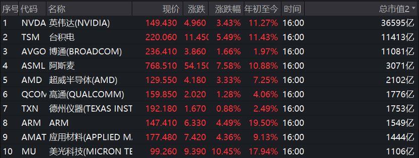 美股芯片股集体上涨,美光科技大涨10.45%,阿斯麦涨7.58%,台积电涨5.49%,英伟达、AMD、ARM涨幅均在3%以上。