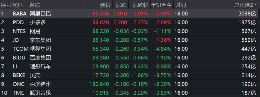 热门中概股跌多涨少,阿里巴巴和拼多多实现上涨;携程集团、理想汽车跌3%以上,网易、京东集团、百度集团、贝壳等均有小幅下跌。