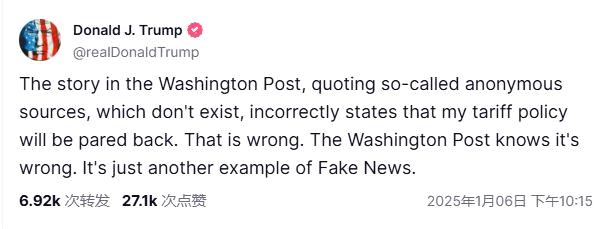 随后,特朗普在社交媒体平台发文表示,《华盛顿邮报》关于关税政策将缩水的报道不实。美元指数随即短线拉升,非美货币涨幅回落。