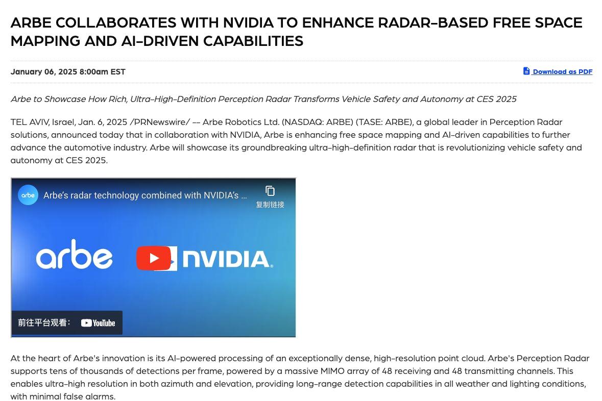 与赛轮思的“剧本”一样,Arbe Robotics周一早晨发公告宣布与英伟达展开合作。公司正在增强自由空间映射和基于AI的能力,并将在本周的消费电子展(CES)上展示其“革命性的超高清晰度雷达”。