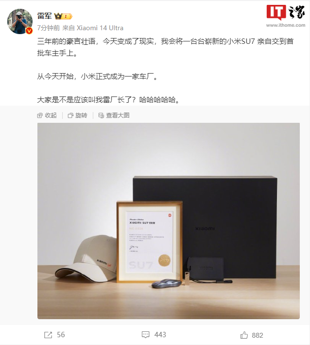 燃点网 4 月 3 日消息,刚刚小米集团董事长雷军在微博发文称,“三年前的豪言壮语,今天变成了现实,我会将一台台崭新的小米 SU7 亲自交到首批车主手上。从今天开始,小米正式成为一家车厂。大家是不是应该叫我雷厂长了?哈哈哈哈哈。”