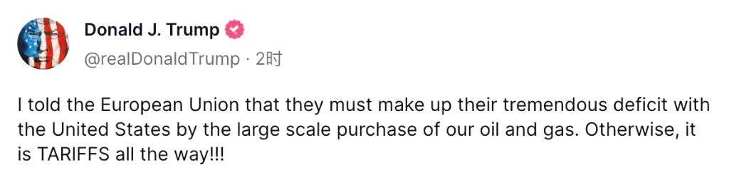 12月20日,美国当选总统特朗普对欧盟发出关税威胁称,欧盟必须通过大量购买美国的石油和天然气,来弥补对美国的巨大贸易顺差,不然就会对欧盟征收关税。