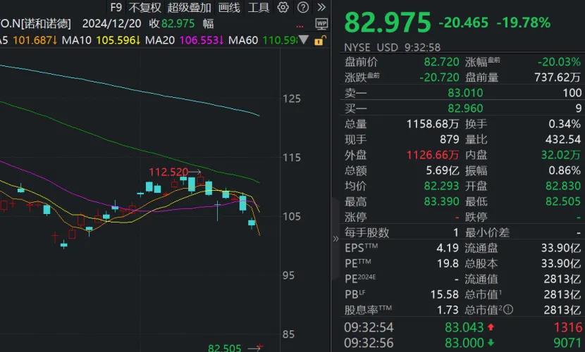 20日晚间,因减肥药试验结果不及预期,诺和诺德股价在欧洲市场一度大跌超28%。美股市场上,诺和诺德美股盘前一度大跌近30%,为该公司有记录以来最大跌幅。美股开盘后,诺和诺德跌近20%,最终跌幅收窄至17.83%。