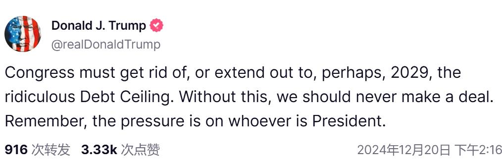就在这篇文章发稿前,特朗普又在社交媒体上发声,强调国会必须取消债务上限,或者暂停债务上限直到2029年,否则“永远都不应该达成协议”。