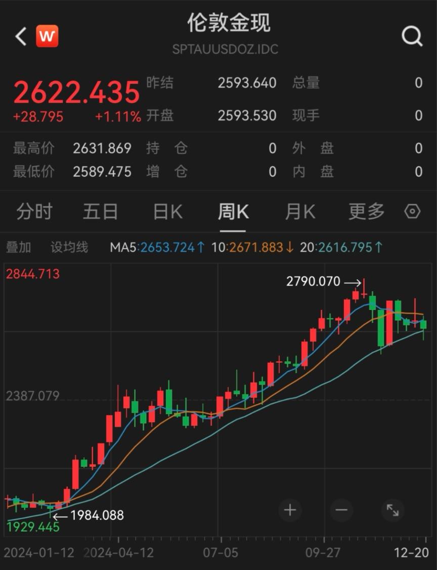 近日,国际金价持续走低,COMEX黄金、伦敦金现于12月18日分别下跌2.34%、2.31%,均创下月内最大日跌幅。截至12月20日,COMEX黄金、伦敦金现分别报2640.5美元/盎司、2622.435美元/盎司,周跌幅分别为1.32%、0.94%。