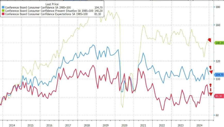 世界大型企业联合会周一公布的数据显示,美国12月消费者信心指数下降至104.7,远低于预期值113.2,前置为112.8。