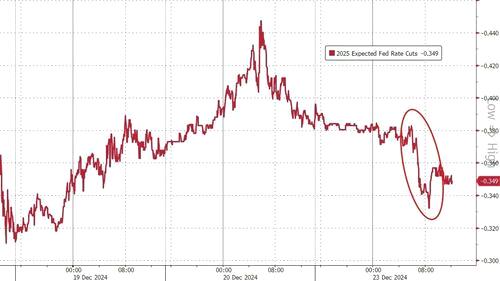 利率掉期合约显示,交易商最新押注的明年降息幅度,目前正进一步低于美联储官员们在点阵图中预计的50个基点。到2025年底,利率合约所定价的降息幅度仅为34个基点——更接近于只降息一次。