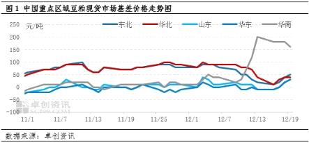 自11月开始,国内大豆通关问题持续发酵,原料供应节奏的变动直接导致上游开工计划调整频繁。12月以来,市场焦点自北向南转移,停机较为集中的地区由前期的华北、山东转为华南,区域性供应收紧使得现货市场基差价格整体呈现南强北弱局面。