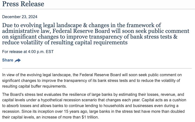 恐怕已经知晓诉讼准备的美联储,在周一收盘后发布公告,称准备对压力测试的重大变更寻求公众意见,旨在增加透明度并减少结果的波动性。