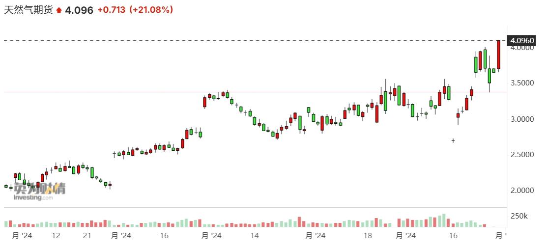 美东时间周一,美国2月份交割的天然气期货一度大涨24.00%,报4.195美元/百万英热,创2023年1月以来最高水平。