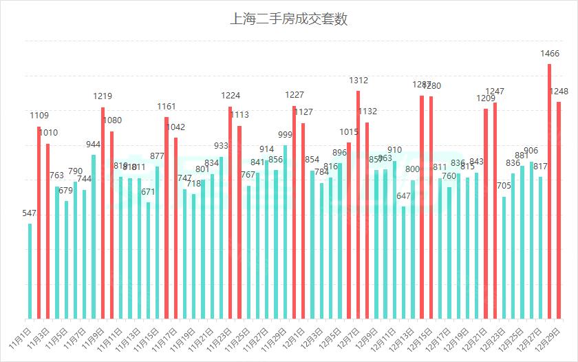 网上房地产数据显示,12月28日(周六),上海单日二手房网签成交1466套,超越10月13日的1334套,创年内二手房单日成交新纪录。12月29日(周日),网签成交量仍维持高位,成交套数1248套,周末两日共计成交套数达2714套,亦成为年内成交套数最多的一个周末。