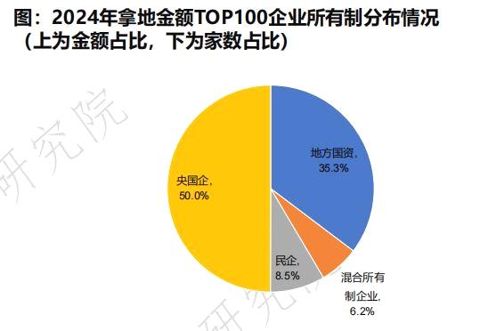 王琳分析称,央国企及地方国资仍是拿地的绝对主力。2024年,拿地金额TOP100企业中,央国企及地方国资家数和金额占比超八成,其中央国企拿地金额占比约50%。受销售能力、融资能力、交付能力等多方面因素影响,央国企获得土地资源的优势明显,中海地产、保利发展、华润置地、建发房产、招商蛇口、中建壹品、越秀地产、中国金茂等央国企位列拿地金额前十。