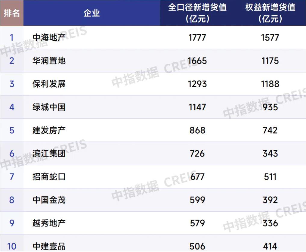 中指院数据显示,TOP10企业2024年新增货值总额9835.5亿元,占TOP100企业的35.5%,新增货值门槛为121亿元。其中,中海地产、华润置地和保利发展的新增货值位列前三。2024年,中海地产新增货值为1777亿元,华润置地新增货值为1665亿元,保利发展新增货值为1293亿元。