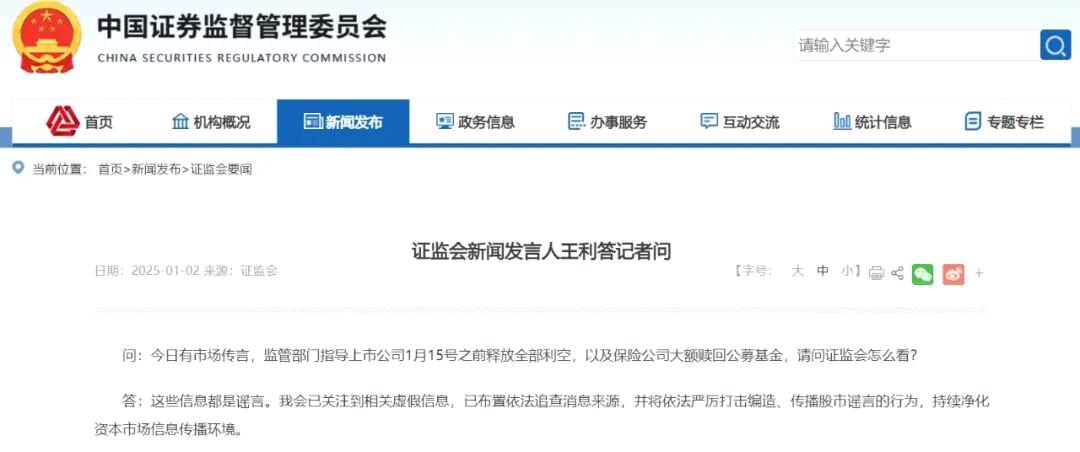 1月2日晚间,针对当日有市场传言“监管部门指导上市公司1月15号之前释放全部利空,以及保险公司大额赎回公募基金”,证监会新闻发言人王利回应称,这些信息都是谣言。证监会已关注到相关虚假信息,已布置依法追查消息来源,并将依法严厉打击编造、传播股市谣言的行为,持续净化资本市场信息传播环境。