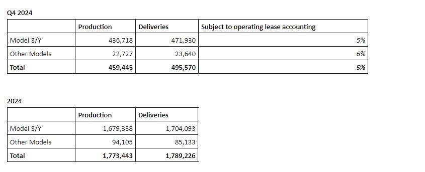 数据显示,特斯拉2024年第四季度交付49.56万辆,预估51.23万辆,其中Model 3/Y 交付47.19万辆,预估48.46万辆;2024年第四季度汽车产量45.94万辆,预估50.52万辆,其中Model 3/Y 产量43.67万辆,预估48.13万辆。
