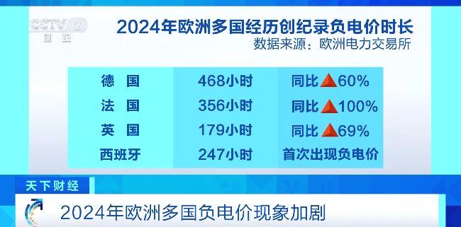 2024年全年,德国负电价时长达468小时,同比增长60%;法国翻倍至356小时;英国负电价时长达179小时,同比增长69%;西班牙首次出现负电价,总计247小时。