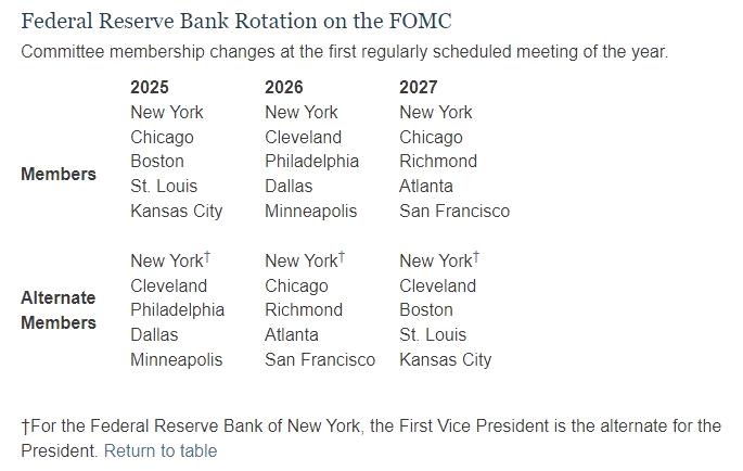 根据规定,所有19位FOMC成员都参加每次FOMC会议,但只有12位有投票权:7位美联储理事加上纽约联储主席,以及其余11位地区联储主席中的4位。4位地区联储主席的任期为一年。